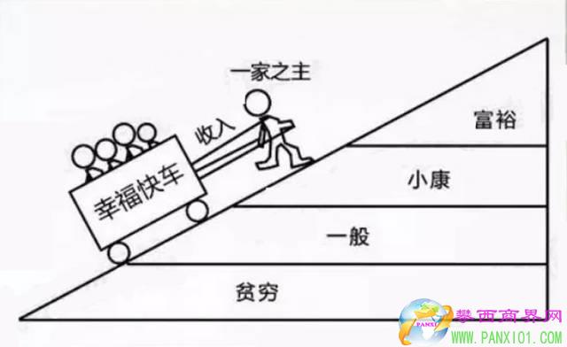 幸福的人生就像是在走上坡路。我們的生活水平一般分為四個階段:貧窮、一般、小康、富裕,每個家庭都有一輛幸??燔?,車?yán)镒覀兊母改?、配偶和孩子。每個家庭由一家之主拉著這輛車,每根繩子代表收入,收入越高,速度越快。