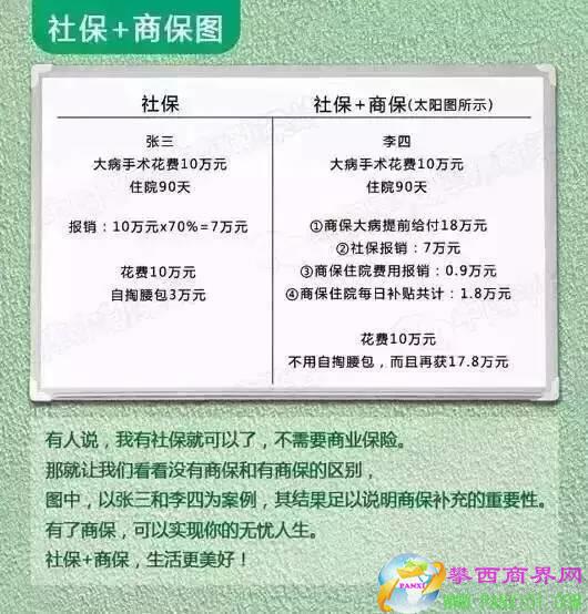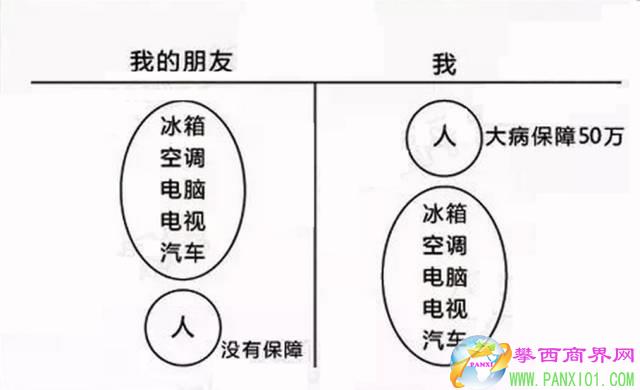 假如有一天,我和朋友都得了大病,需要30萬:我的朋友只得先賣車、再賣空調(diào)、冰箱……一場大病,什么都沒有了,而我有保險,一場大病賠償50萬,生活水平?jīng)]有下降,反而多了一筆錢。我們過著一樣的生活,結(jié)果為什么不同呢?