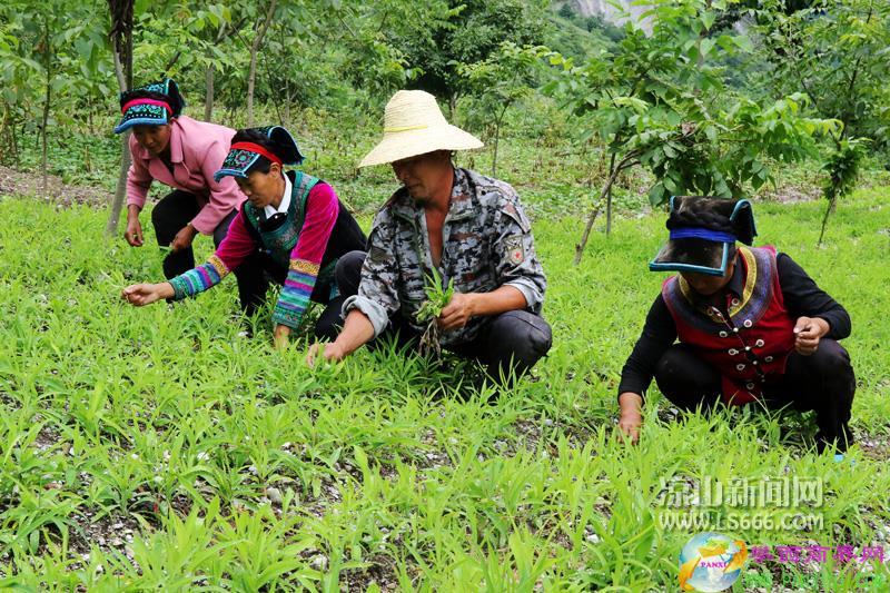圖為甘洛縣康源中藥材種植農(nóng)民專業(yè)合作社社員正在藥材基地里對藥材進行管護。施建華 攝影報道