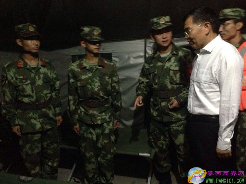 2016年9月23日晚上7點30分,攀枝花市市長來到仁和區(qū)大田鎮(zhèn)214省道被山洪沖毀的搶險點,看望正在連夜加班加點作業(yè)的武警水電第九支隊官兵,詢問災(zāi)情和道路修復進度情況。8點10分,來到了武警水電第九支隊宿營地看望慰問營地換班休整的官兵。看到武警水電官兵住在帳篷里親切的問:"有沒有地方洗澡?",九支隊后勤處副處長趙云回答:"我們自己帶有凈水車和淋浴車,能夠滿足官兵的洗浴要求"。后勤處副處長趙云和一大隊教導員唐義夫還就搶險任務(wù)、完成情況、后勤保障等一一做了介紹。