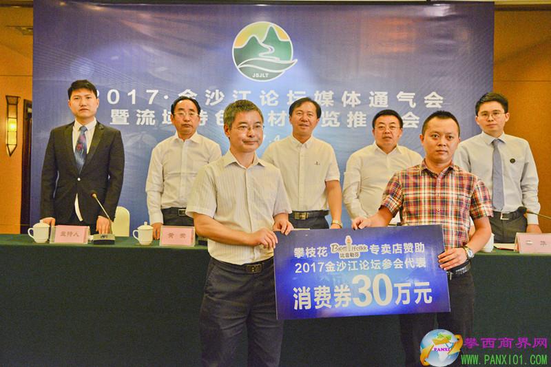 通氣會(huì)上,攀枝花比音勒芬專賣店總經(jīng)理施從軍先生向2017·金沙江論壇參會(huì)代表贊助30萬元體驗(yàn)消費(fèi)劵。據(jù)了解,本次論壇受到流域社會(huì)各界的廣泛關(guān)注、大力支持和積極參與。施從軍先生不僅是攀枝花市東區(qū)政協(xié)委員、也是攀枝花市陽光康養(yǎng)產(chǎn)業(yè)研究會(huì)常務(wù)會(huì)長(zhǎng)、市瀘州商會(huì)副會(huì)長(zhǎng),年輕有為、事業(yè)有成,而且熱心公益、社會(huì)責(zé)任感強(qiáng)。