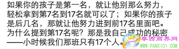 我發(fā)現(xiàn)大陸家長(zhǎng)很在意成績(jī),都想讓孩子考第一名。其實(shí),現(xiàn)在世界精英都不是當(dāng)年的尖子生,他們?cè)诎嗉?jí)的排名是第7名到第17名。原因就是這些孩子人際關(guān)系更好,可以和第一名做朋友,也可以和最后一名做朋友,而且孩子壓力小,生活更輕松,創(chuàng)意最好。