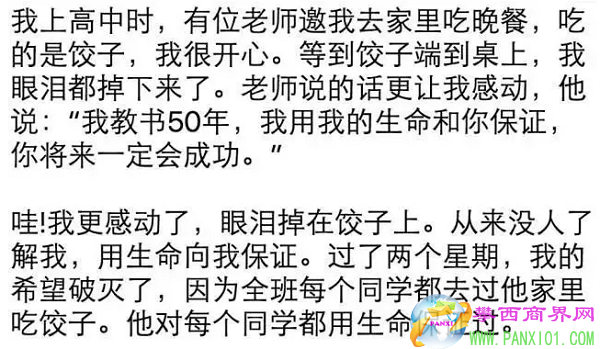 我小時(shí)候讀書(shū)差,考試都考紅字,就是考不到60分。有一年考試,我好不容易超過(guò)60分,很高興地拿回家給爸爸看。我爸爸正吃飯,他放下碗哈哈大笑。哥哥姐姐很奇怪,考這么爛還笑。