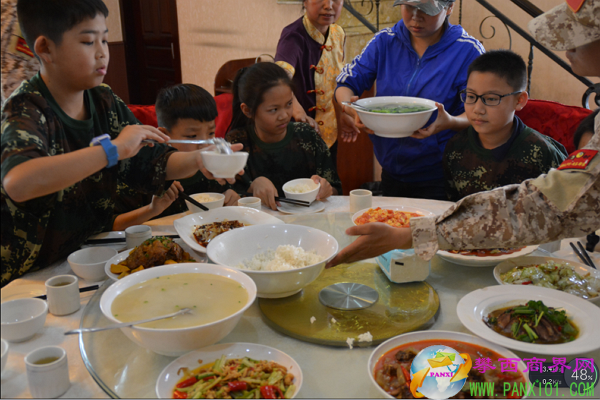 帶隊老師身先士卒,幫助上菜的服務(wù)員上菜,而小隊的正副隊長在老師的提示下,積極主動的幫隊友們添飯