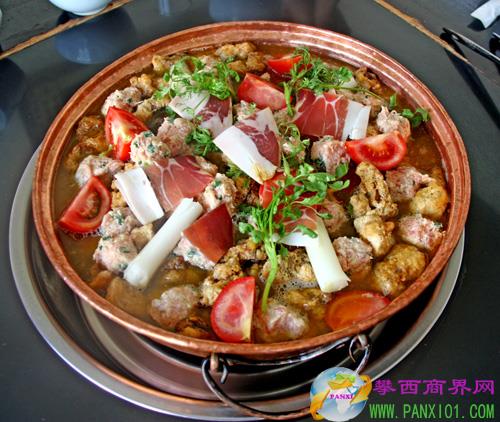 鹽邊風(fēng)味菜之全羊湯鍋。這是傈僳族的傳統(tǒng)菜,據(jù)傳傈僳族在山上將羊宰殺,用羊皮毛方朝下,肉皮方朝內(nèi)繃在四根濕木樁上形成皮鍋摻水煮羊肉,可以不用鍋就能殺羊吃。現(xiàn)在所有的民族都會(huì)做羊肉全鍋湯,但做法各有差異。鹽邊菜之羊肉全鍋湯是選高山喂養(yǎng)的公羊宰殺精制而成。椒味、辣味、麻味、香味伴著肉油的特色菜從口腔內(nèi)沁人肺腑的四溢,叫人刻骨銘心的痛快。