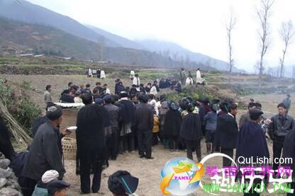 在槍聲陪伴下主方抬起砣砣肉和蕎餅,讓客人自由組合成團(tuán),不分男女老幼,不管相識或相關(guān)與否,按人頭分給一份砣砣肉、蕎餅或米飯。待到在場的人都得到一份時,主人鳴槍,大聲宣布喪事圓滿結(jié)束,并勸各路賓客回到村寨吃點便餐再走。至此,有宴者可以赴宴,無宴者可以歸家,整個喪葬儀式便告完成。