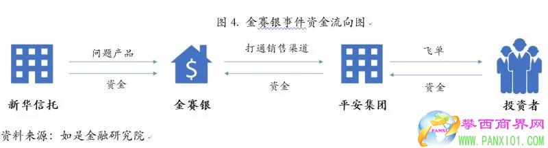 其中涉案規(guī)模最大,最為引人注目的是金賽銀基金事件。2015年10月,深圳金賽銀基金管理有限公司陷入60億元兌付危機中,金賽銀負責人王維奇跑路,客戶的幾十億資金無處追討,無處申訴;而平安人壽被曝由其業(yè)務員向客戶兜售的巨額金賽銀理財產品無法兌付。通過高檔豪華會所裝門面、拉攏政府官員打著政府項目的旗號推銷、打平安保險擔保的幌子、宣傳公司掛牌上海股交中心等方式,金賽銀公司吸引了大量投資者購買其理財產品,但這些錢實則進入了王維奇的個人私款。這一事件的背后,存在著一條“有毒資產”轉嫁鏈條:信托公司把信托貸款、債權等問題產品轉給第三方私募接盤;私募公司金賽銀通過動員平安員工“接飛單”等方式,打通了平安集團的銷售渠道,募得巨額資金,最終挪作它用,導致原本就存在問題的資產鏈條斷裂。