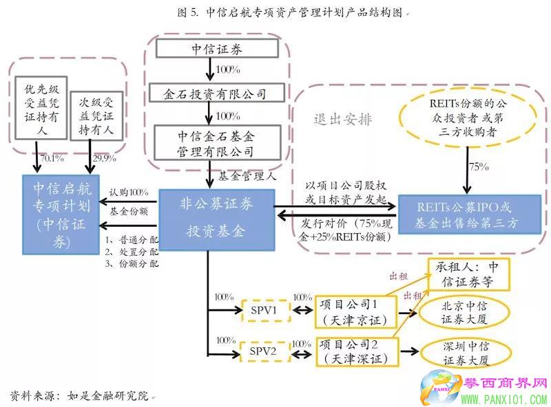而規(guī)范的金融產品,盡管其結構設計較為復雜,卻有容易變現(xiàn)的底層資產作為保障。以國內首只REITs中信啟航為例,其資產結構較為復雜,卻十分清晰,擁有北京、深圳的中信證券大廈的租金收入作為底層資產。在這一產品中,中信證券首先在天津注冊成立兩家全資子公司——天津京證、天津深證,然后將北京中信證券大廈、深圳中信證券大廈的房地產權屬分別過戶天津京證、天津深證,之后再將天津京證、天津深證的全部股權轉讓給中信金石基金管理有限公司擬發(fā)起設立的非公募基金的全資孫公司中信金石基金。中信金石基金作為非公募基金的投資載體,向中信證券收購天津京證和天津深證的股權,以達到為非公募基金的投資者提供投資業(yè)務的目的。另一方面,中信證券成立中信啟航專項資產管理計劃,募集資金100%認購基金份額,按70.1%:29.9%的比例劃分為優(yōu)先級和次級,向非公募基金出資。項目公司獲取的租金收入用于分配專項資管計劃的收入。