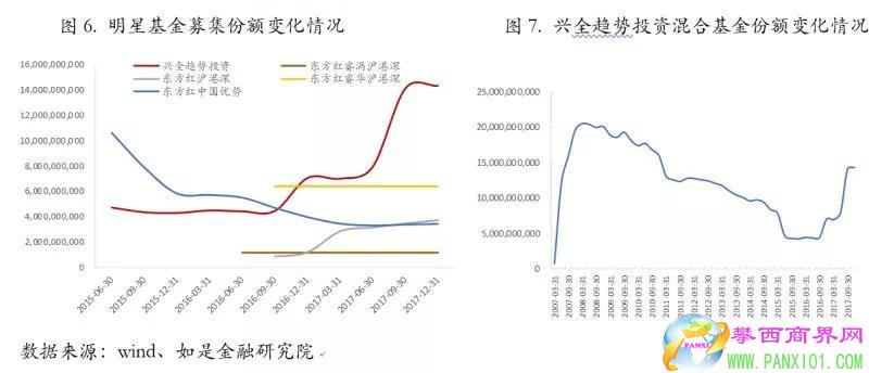 而一些正規(guī)投資渠道的項目或理財產品,往往不會存在反復融資的情況,大多會將融資規(guī)??刂圃谝欢ǚ秶鷥?。從圖6列舉的五只明星基金的募集份額情況來看,東方紅睿滿滬港深、東方紅睿華滬港深、東方紅滬港深、東方紅中國優(yōu)勢的募集份額均維持得十分平穩(wěn),其中前兩只基金的份額在成立以來均維持不變,東方紅中國優(yōu)勢的份額甚至還有下降。興全趨勢投資混合基金的募集份額雖然在近兩年來有較快的增長,但其募集份額規(guī)模較更早時候的2008年來看,也有明顯的下滑;2008年3月31日,該基金的募集份額一度高達20536270957份。