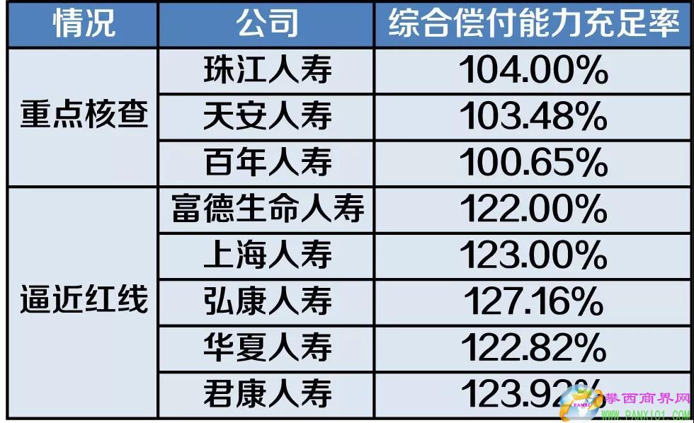 除不達(dá)標(biāo)險(xiǎn)企外,2018年第四季度有3家險(xiǎn)企被列為重點(diǎn)核查對(duì)象,分別是珠江人壽、天安人壽和百年人壽,其綜合償付能力充足率分別為104%、103.48%和100.65%。此外,有5家人身險(xiǎn)公司的綜合償付能力充足率逼近重點(diǎn)核查紅線,分別為富德生命人壽、上海人壽、弘康人壽、華夏人壽和君康人壽,其綜合償付能力充足率分別為122%、123%、127.16%、122.82%和123.92%。