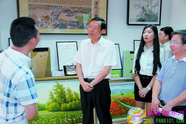 通過(guò)刻苦專研,一個(gè)名叫呂杰的青年創(chuàng)作出了具有獨(dú)特藝術(shù)效果的沙畫藝術(shù)作品,成為我國(guó)固彩沙畫的首創(chuàng)者。調(diào)研中,張剡來(lái)到位于釩鈦科技孵化器的呂杰沙畫工作室,與呂杰深入交流,為他出主意、想辦法,厘清創(chuàng)業(yè)思路,鼓勵(lì)他腳踏實(shí)地開拓市場(chǎng),努力實(shí)現(xiàn)自己的創(chuàng)業(yè)夢(mèng)想。