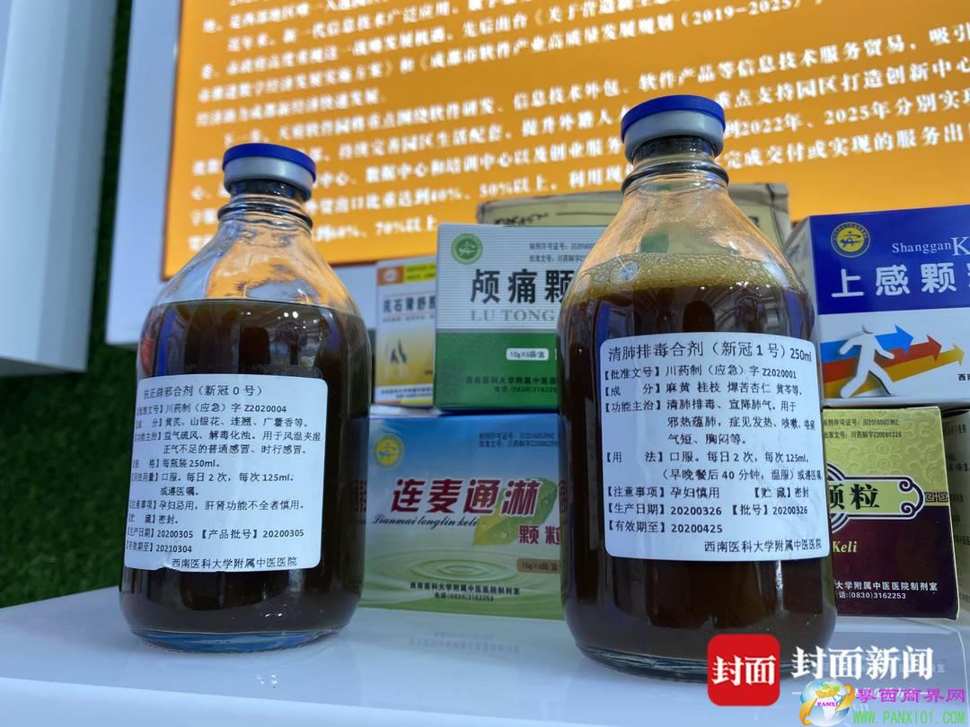 在四川展館的另一端,西南醫(yī)科大學附屬中醫(yī)醫(yī)院的展臺吸引了幾名老年觀眾的注意。展臺上最為醒目的是兩瓶名為“新冠0號”和“新冠1號”的中藥制劑。負責藥品銷售的金宗彬介紹,這次展出的藥品均由醫(yī)院自主研發(fā)的,其中“新冠0號”主要用于新冠肺炎的預防,“新冠1號”用于新冠肺炎的治療。這兩種藥品在今年2月就已通過省藥監(jiān)局審批,在全省多家新冠肺炎定點救治醫(yī)院直接調劑使用。