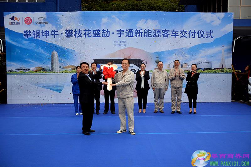 攀西商界網(wǎng)報(bào)道(記者 熊毅)11月10日,攀鋼集團(tuán)坤牛物流運(yùn)聚機(jī)動(dòng)車(chē)檢測(cè)站內(nèi)禮炮齊鳴、汽笛長(zhǎng)鳴、燈光閃爍,鄭州宇通客車(chē)股份有限公司通過(guò)攀枝花市盛劼勞務(wù)服務(wù)有限公司墊資正式將10臺(tái)宇通新能源汽車(chē)鑰匙交給攀鋼集團(tuán)攀枝花坤牛物流有限公司經(jīng)營(yíng)。此舉標(biāo)志著我市民營(yíng)企業(yè)助力打造“攀鋼航母艦隊(duì)”,開(kāi)啟三方合作共贏的新局面。