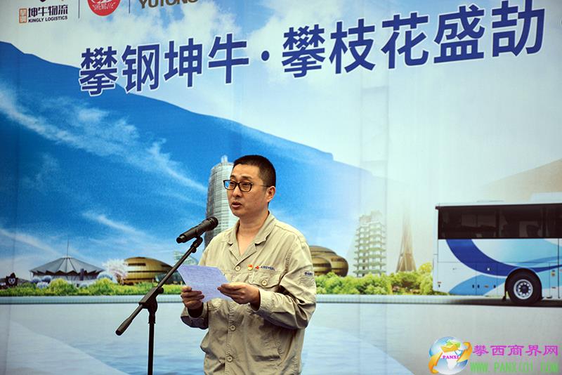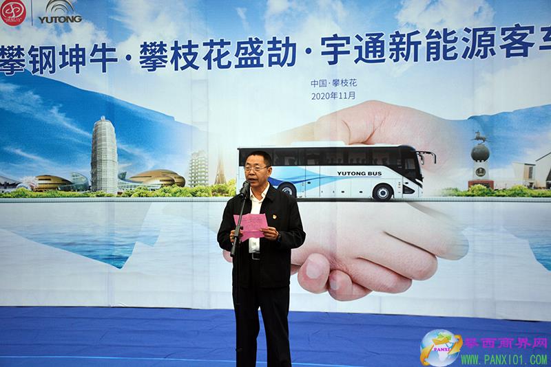 市工商聯(lián)黨組成員、副主席、市總商會(huì)黨委書(shū)記劉寶林,鄭州宇通客車(chē)股份有限公司攀西經(jīng)理薛甲秀,攀枝花市盛劼勞務(wù)服務(wù)有限公司法定代表人周業(yè)俊,攀鋼集團(tuán)攀枝花坤牛物流有限公司法定代表人許可出席并致辭。市工商聯(lián)秘書(shū)長(zhǎng)陳忠榮出席客車(chē)交接儀式。