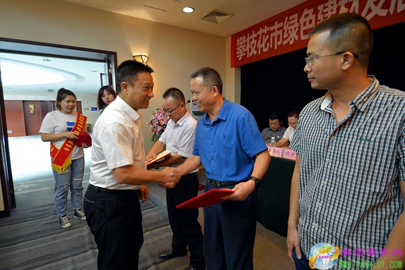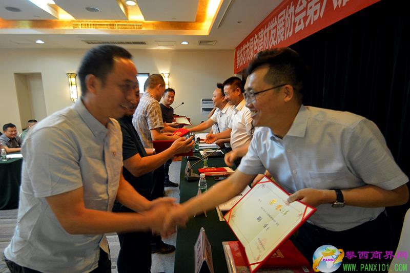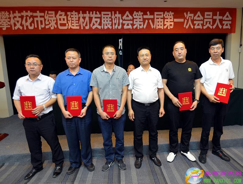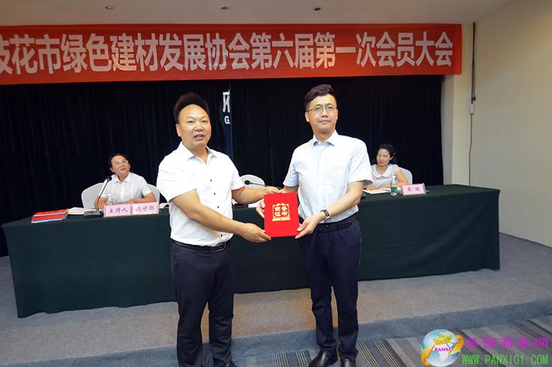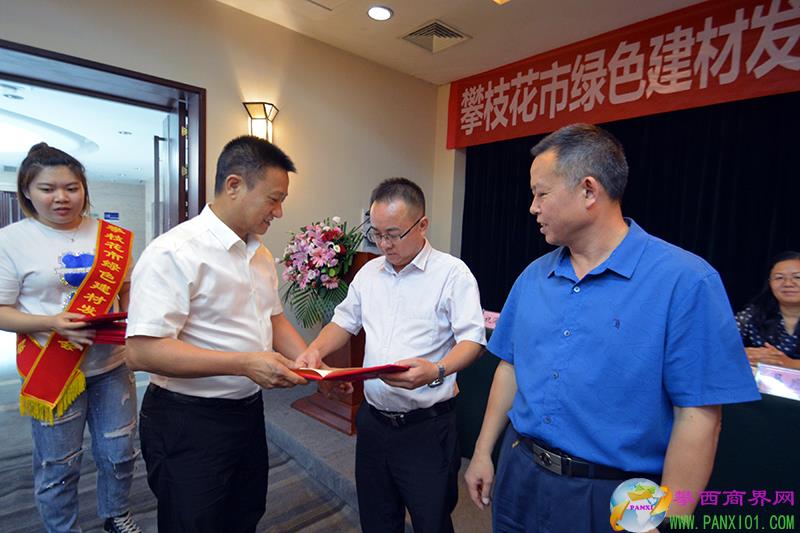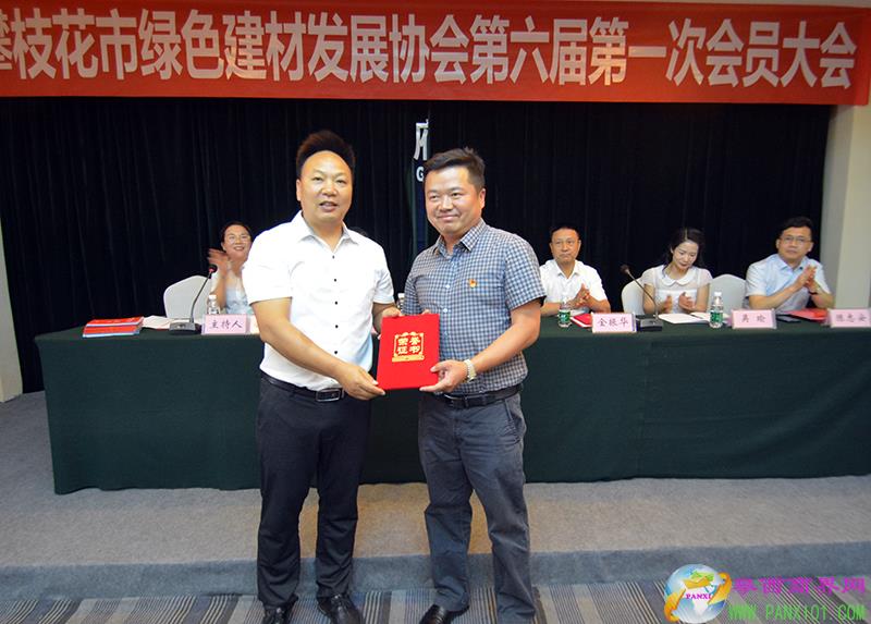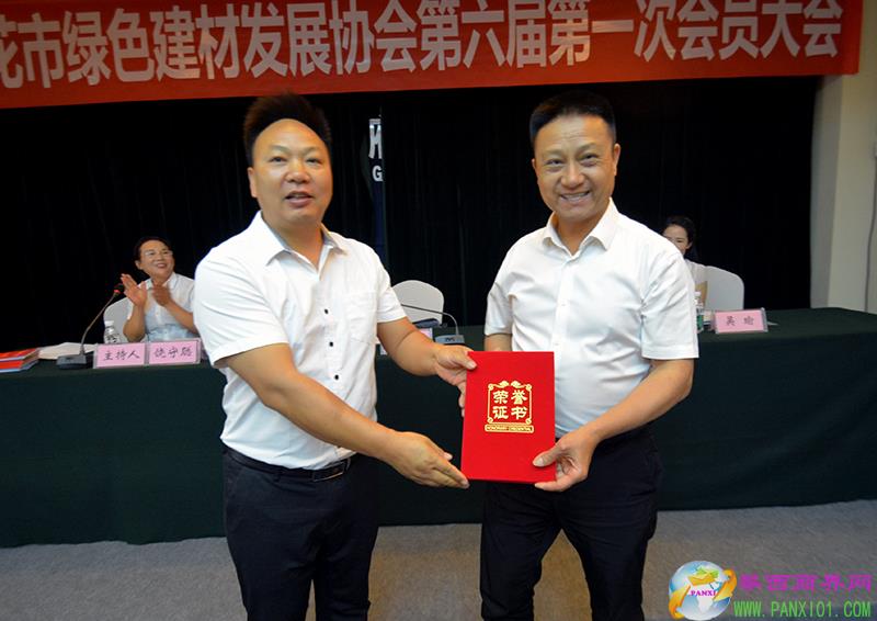 攀枝花市工商聯(lián)秘書長陳忠榮為新當選的攀枝花市綠色建材發(fā)展協(xié)會第六屆會長頒發(fā)榮譽證書并合影。