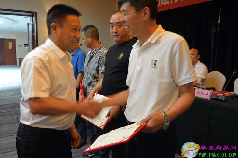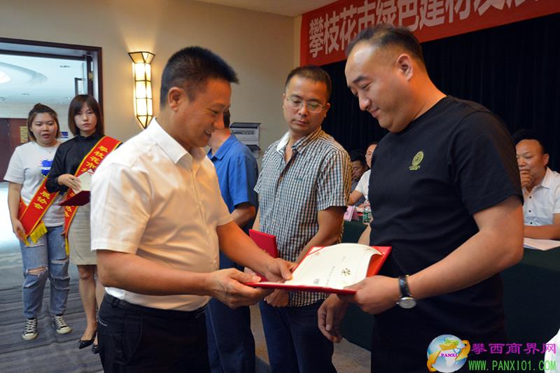 攀枝花市工商聯(lián)秘書長陳忠榮為新當選的攀枝花市綠色建材發(fā)展協(xié)會第六屆秘書長頒發(fā)榮譽證書并合影。