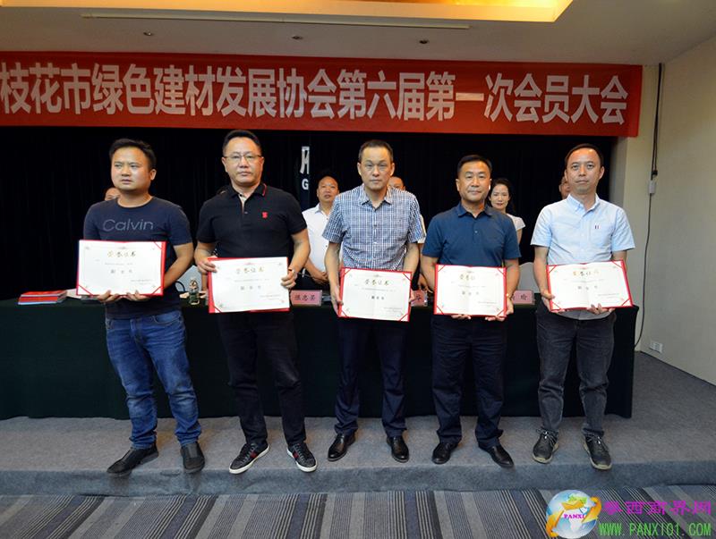 攀枝花市工商聯(lián)秘書長陳忠榮為新當選的攀枝花市綠色建材發(fā)展協(xié)會第六屆監(jiān)事會主席頒發(fā)榮譽證書并合影。