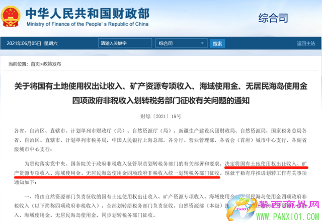 通知指出,將國有土地使用權(quán)出讓收入、礦產(chǎn)資源專項收入、海域使用金、無居民海島使用金四項政府非稅收入統(tǒng)一劃轉(zhuǎn)稅務(wù)部門征收,并自2022年1月1日起全面實施征管劃轉(zhuǎn)工作。
