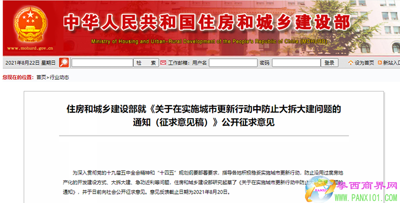 為深入貫徹黨的十九屆五中全會精神和“十四五”規(guī)劃綱要部署要求,指導各地積極穩(wěn)妥實施城市更新行動,防止沿用過度房地產(chǎn)化的開發(fā)建設方式、大拆大建、急功近利等問題,住房和城鄉(xiāng)建設部研究起草了《關(guān)于在實施城市更新行動中防止大拆大建問題的通知》,并于日前向社會公開征求意見。意見反饋截止日期為2021年8月20日。