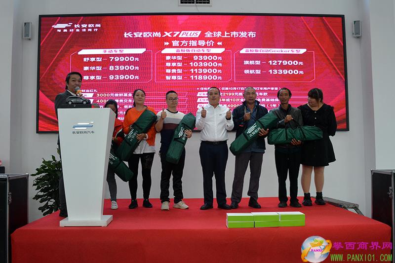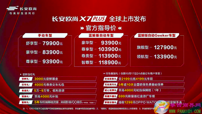 上市當天,購買新車還推出了三重驚喜大禮,為用戶帶來“超值之選”。其中,第一重驚喜大禮為3000元嘗鮮基金,12月31日前下訂成交的用戶,除手動舒享型、手動豪華型及自動豪華型三款車型以外均可享受。第二重驚喜大禮為四大嘗鮮豪禮,除手動舒享型車型以外,所有車型均享交車禮(交車即得4000元尊貴交車禮包)、金融禮(購車即享5萬-9萬零、低利息貸)、置換禮(置換即享至高4000元補貼)三大豪禮,藍鯨版自動尊貴型及以上車型再額外享受智聯(lián)禮(購車即送5年超長免費基礎(chǔ)流量+央視影音或QQ音樂一年會員權(quán)益)。第三重驚喜大禮為任性疊加禮,除手動舒享型車型以外,只要是10月17日24點前訂車的用戶,均可享受定金膨脹禮(交2199元抵4199元車款,定金膨脹抵車款)、無憂用車禮(5年或10次全國聯(lián)保免費基礎(chǔ)保養(yǎng)),隨心駕享禮(至高4000元輪胎保險1年)、典藏升值禮(699元限量版長安歐尚X7PLUS紅盒原廠車模)、穿戴設(shè)備禮(抽取1299元OPPO WATCH2專屬定制獨立全智能長續(xù)航手表)五大豪禮。