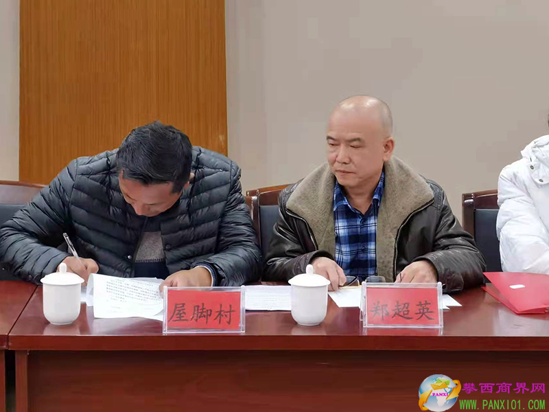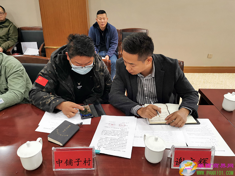 攀枝花水鋼紅發(fā)礦業(yè)有限責任公示辦公室副主任謝文輝(右一)與木里縣雅礱江鎮(zhèn)中鋪子村代表簽訂《“萬企興萬村”助力鄉(xiāng)村振興結(jié)對共建協(xié)議書》,村干部通過手機展示中鋪子村所在位置。