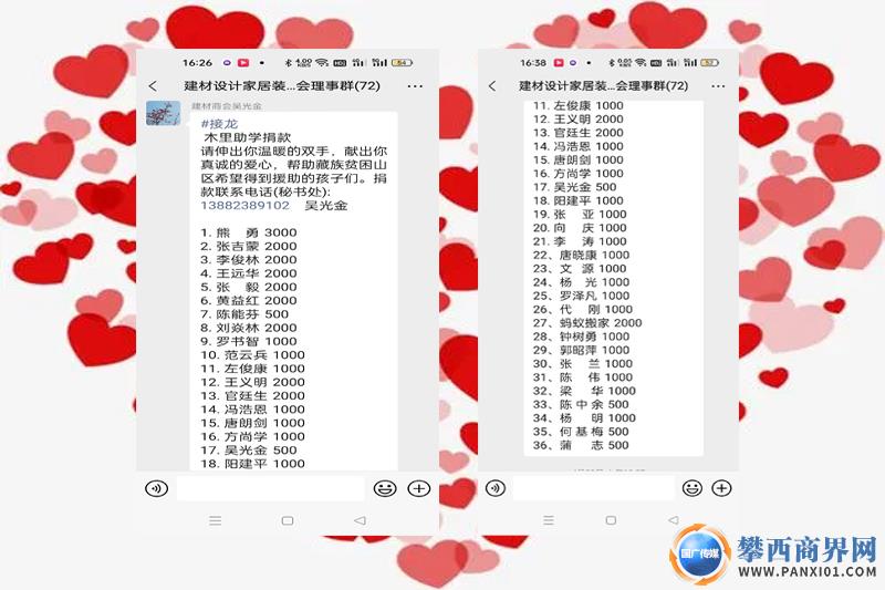商會秘書處向商會會長群、理事群和會員群發(fā)出了《讓愛心充滿陽光》倡議書,引起了廣大會員的強(qiáng)烈反響,愛心不分大小,捐款不分多少,善舉不分先后,一時在群內(nèi)廣為流傳,大家紛紛伸出溫暖的雙手,獻(xiàn)出自己真誠的愛心,從500元,1000元,2000元,3000元不等的金額匯聚了數(shù)十位會員的愛心,籌集到30000元助學(xué)金。在當(dāng)下建材家居設(shè)計裝飾市場不景氣的情況下,商會會員們寧愿過緊日子也要兌現(xiàn)自己莊嚴(yán)的承諾,彰顯了廣大商會會員濃濃的家國情懷和責(zé)任擔(dān)當(dāng)。
