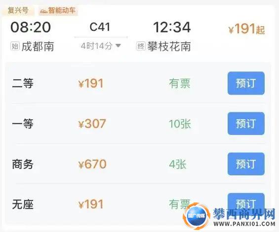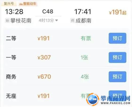 C48攀枝花南站13:28發(fā)車(chē),17:41直達(dá)成都南,歷時(shí)4小時(shí)13分鐘;C41成都南8:20發(fā)車(chē),12:34直達(dá)攀枝花南,歷時(shí)4小時(shí)14分鐘。