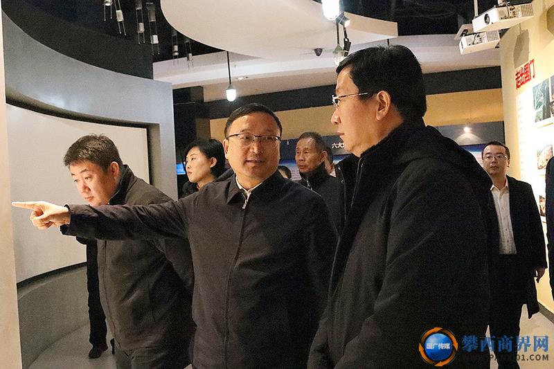 十九冶成都建設(shè)有限公司黨委書記、董事長陳春(中)為廣陽區(qū)委書記陶俊強(右)介紹“西部鐵軍”展廳。
