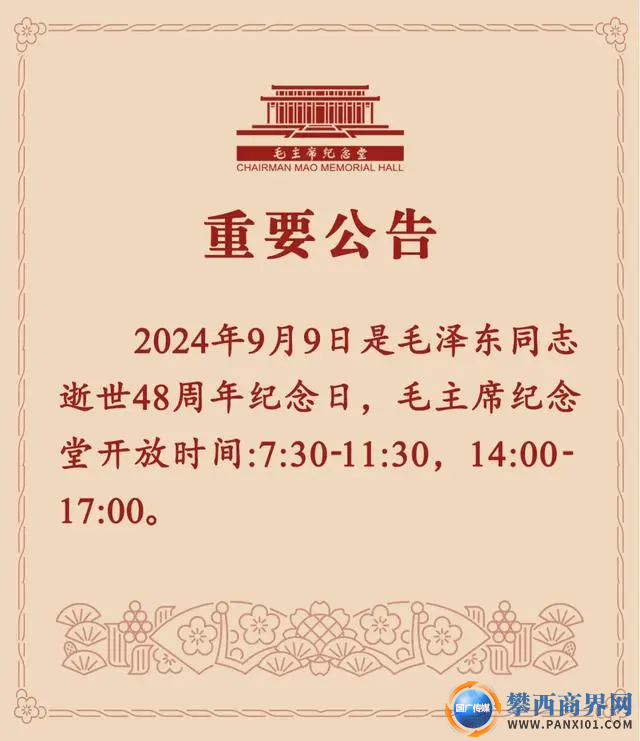 9月5日晚間,毛主席紀(jì)念堂微信公眾號發(fā)布公告:2024年9月9日是毛澤東同志逝世48周年紀(jì)念日,毛主席紀(jì)念堂開放時間:7:30-11:30,14:00-17:00。