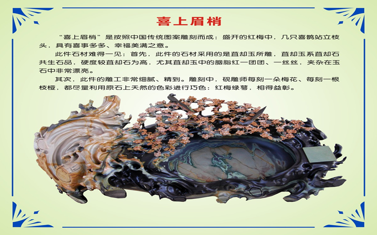 2012年1月,石寶齋選送的《喜上眉梢》在中國(guó)·攀枝花(大笮杯)第三屆全國(guó)觀賞石精品展中榮獲