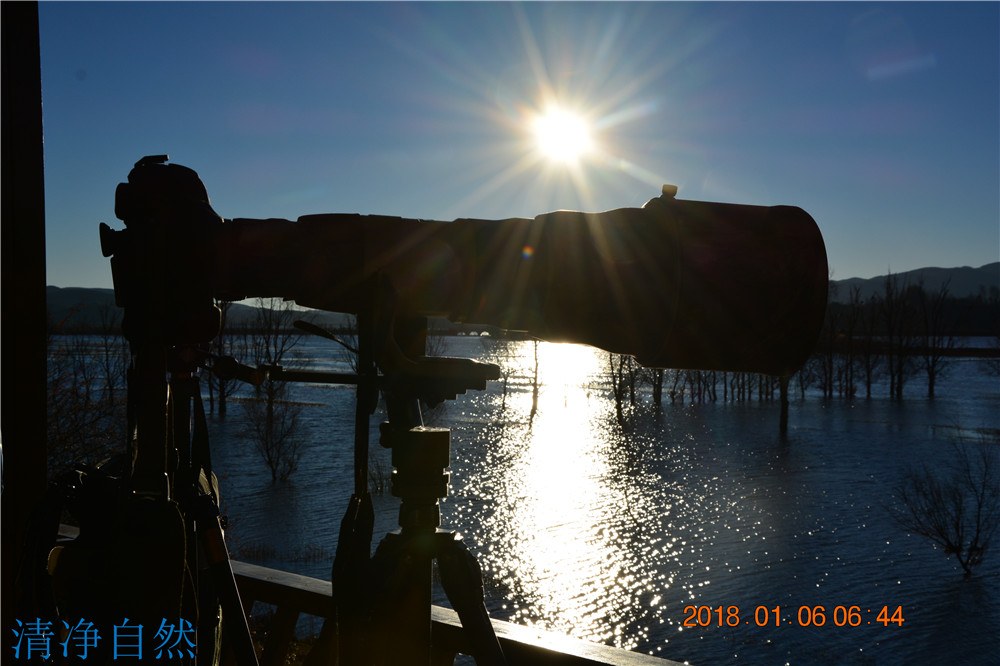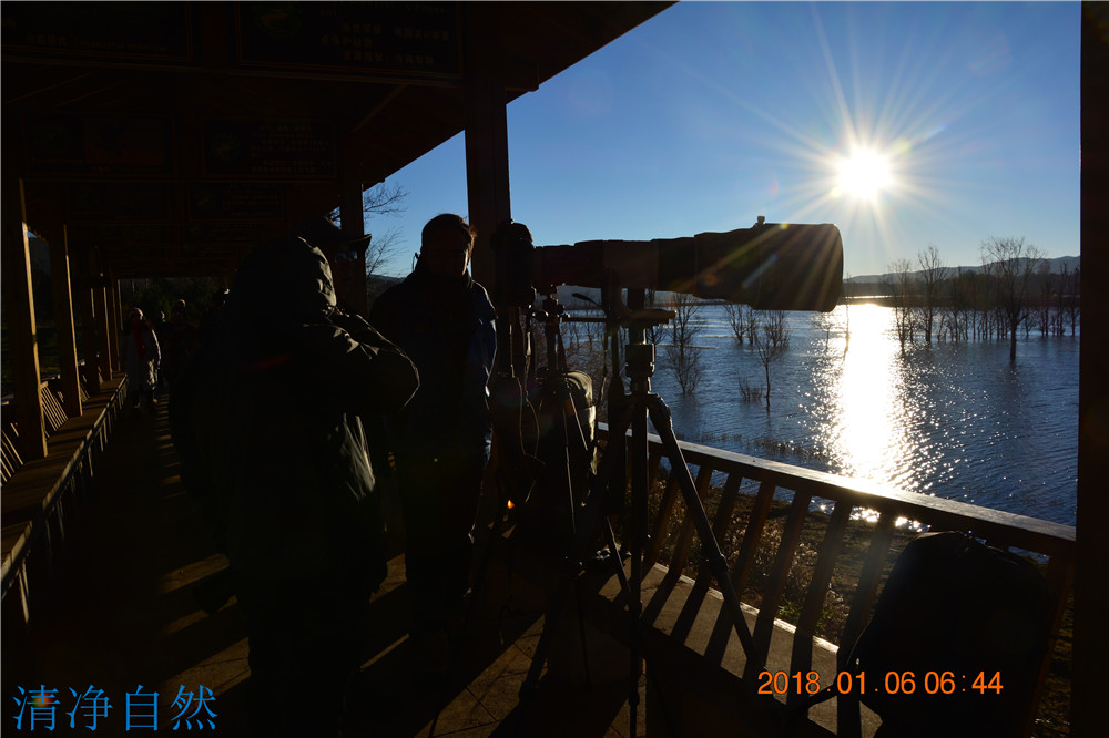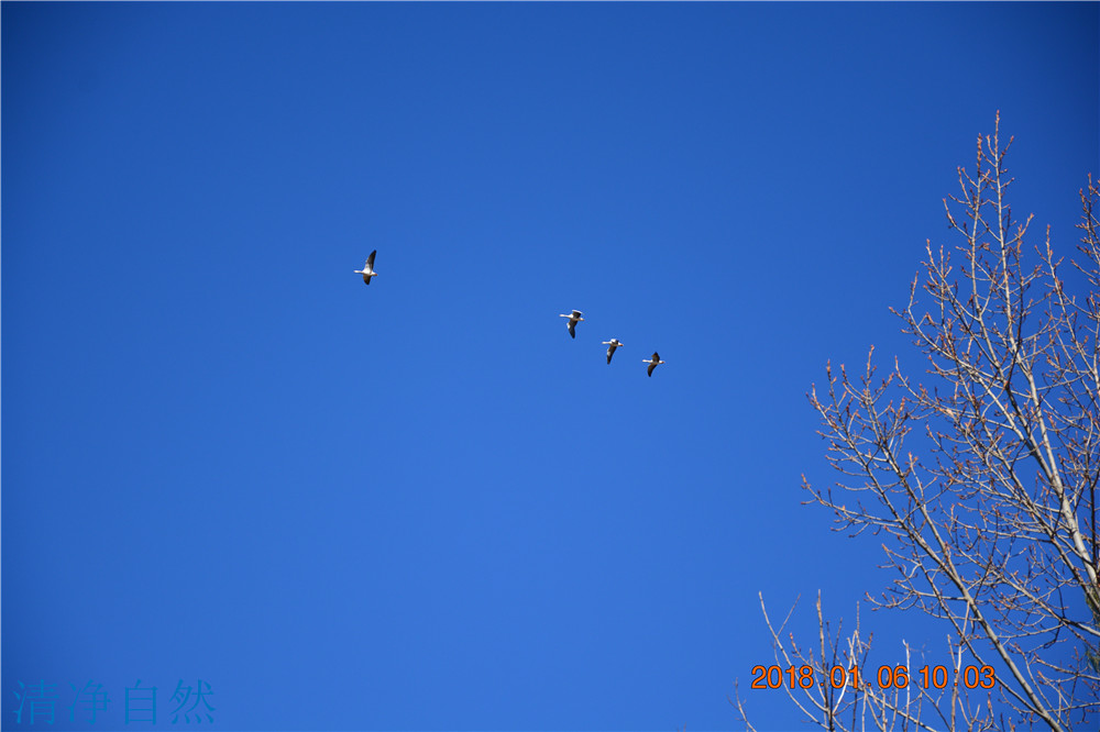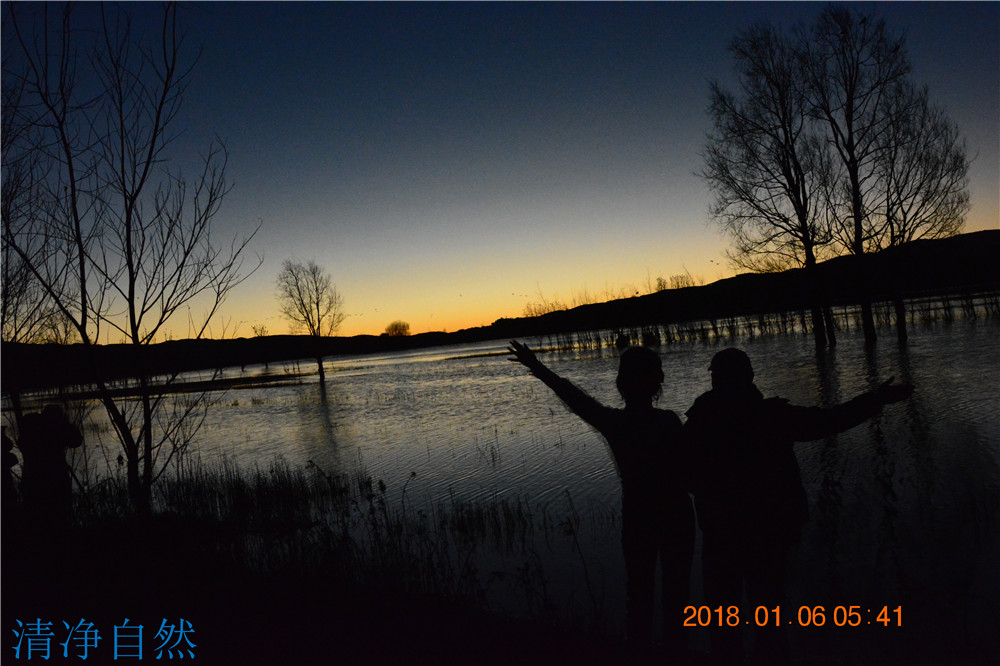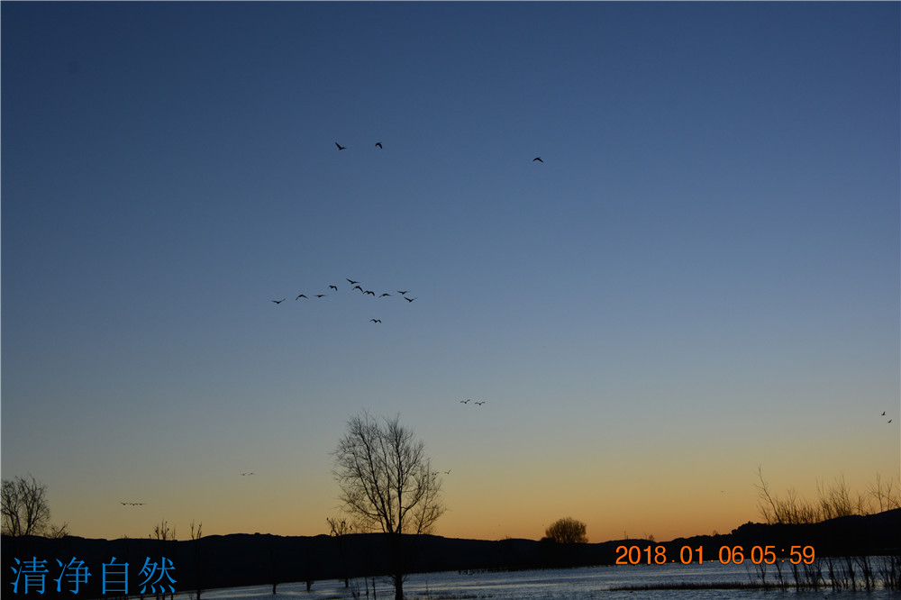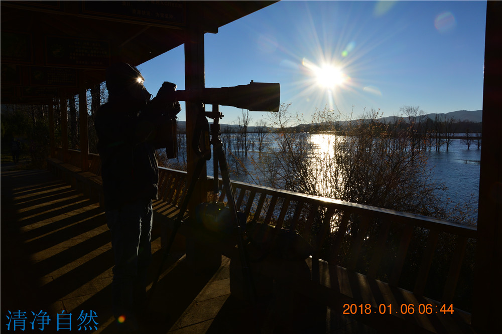 陽光明媚的晴天,這片土地上到處都有鳥的身影,大小相依,黃白相間,或飛或停。你可以看到,人們架著長(zhǎng)長(zhǎng)的攝影機(jī)對(duì)著這些可愛的精靈們攝像,如果不小心把什么東西弄響,便會(huì)驚散了那些準(zhǔn)備照“全家像”的鳥兒。一會(huì)兒撲楞楞地飛起來,到處都是鳥影,到處都有鳥聲。在雪花飛舞的陰天,你仍可看到攝影師們追尋鳥兒的情景,他們有的爬在雪里、有的跪在雪上、有的彎著身子、有的踮起腳尖,全神貫注地瞄準(zhǔn)風(fēng)雪中的“英雄們”。群鳥紛飛,和著漫天飛雪,讓你分辨不出什么是鳥影,什么是雪花。