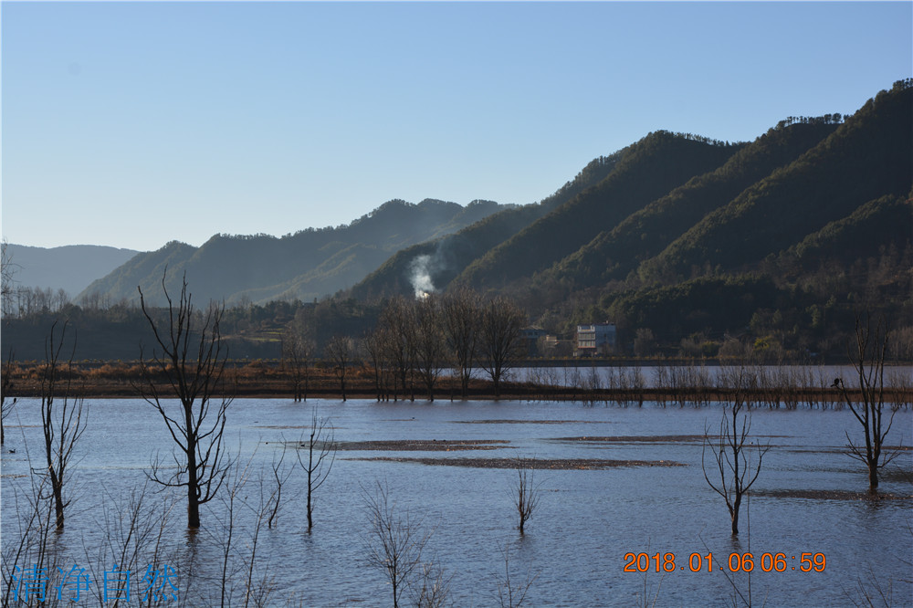 5:李家灣小學(xué)后山??梢耘臄z早晨(不管有無云海)和傍晚,是個(gè)絕佳的好地方。從7,觀鶴山莊走路向南穿過堤壩,再往西到李家灣小學(xué),3km左右,加上爬到山頂,基本是40分鐘左右。也可以開車從北邊繞著湖一圈過來,時(shí)間基本也差不多。和對(duì)面楊梅山的高點(diǎn)相比,距離湖面較近,可以很清晰的拍攝到水面上連排柳樹和飛鳥。