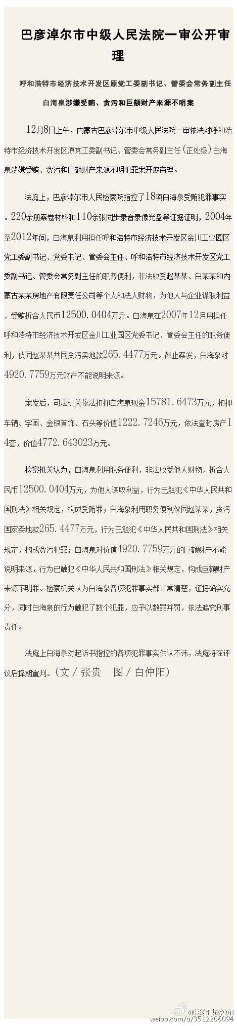 @法治巴彥淖爾官方微博12月8日消息,12月8日上午,內(nèi)蒙古巴彥淖爾市中級(jí)人民法院一審依法對(duì)呼和浩特市經(jīng)濟(jì)技術(shù)開發(fā)區(qū)金川工業(yè)園區(qū)黨工委副書記、黨委書記、管委會(huì)主任、呼和浩特市經(jīng)濟(jì)技術(shù)開發(fā)區(qū)黨工委副書記、管委會(huì)常務(wù)副主任(正處級(jí))白海泉涉嫌受賄、貪污和巨額財(cái)產(chǎn)來源不明犯罪案開庭審理。